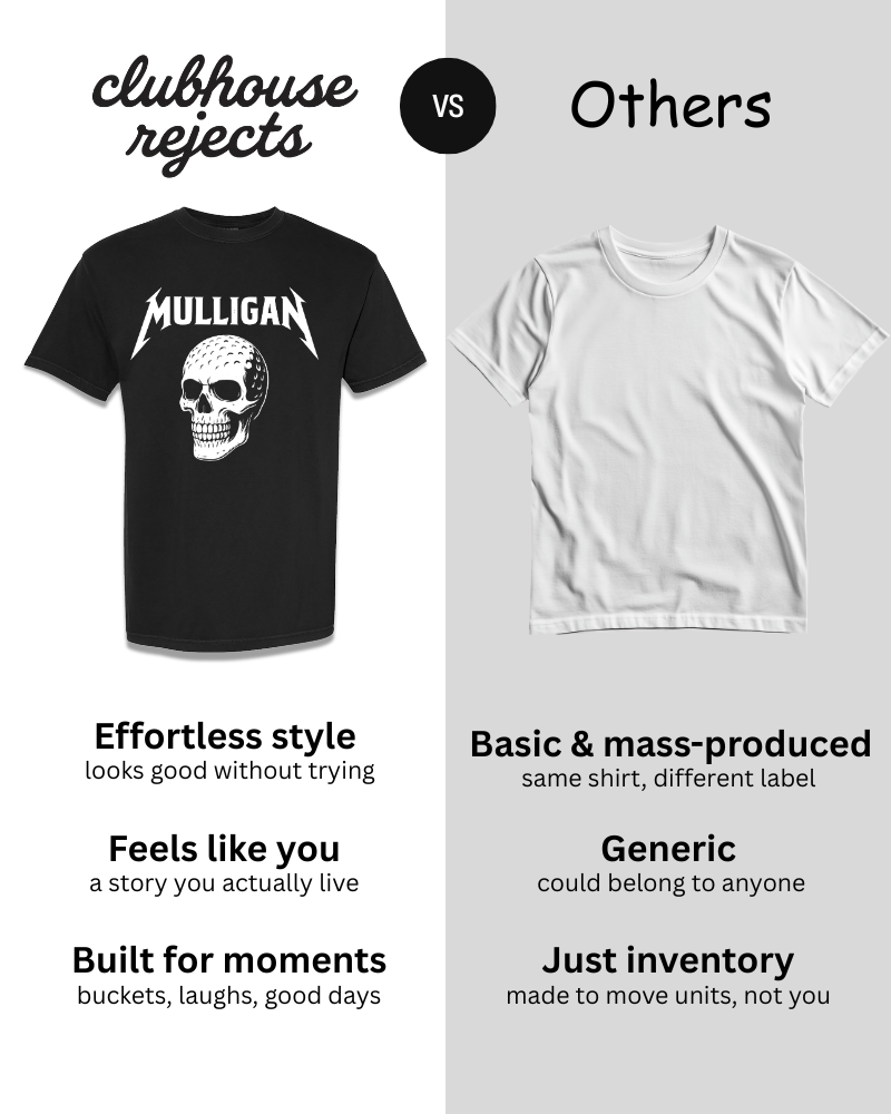 Every Clubhouse Rejects T Shirt is printed on the garment-dyed, heavyweight 100% ring-spun cotton 1717. It’s that soft, broken-in feel from day one with the sturdy weight you want for range nights and weekend rounds no flimsy blanks, no poly blends.